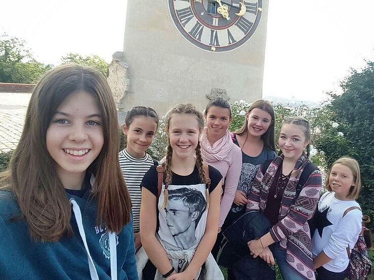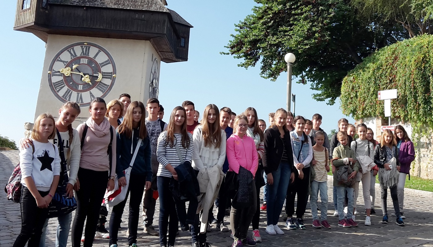 „Aufi auf’n Berg!“ – Mit diesem Zuruf starteten die beiden dritten Klassen ihre Erkundungstour in der steirischen Hauptstadt Graz. Zuerst wurde der Schlossberg erklommen. Zahlreiche Fotos wurden mit und vor dem Uhrturm gemacht.