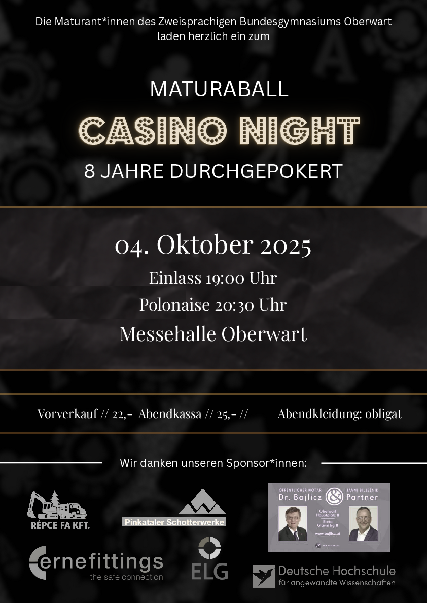 Die Maturant*innen des Zweisprachigen Bundesralgymnasiums Oberwart laden Sie herzlich zu einer unvergesslichen Nacht im Stil von Glanz, Glamour und großen Gewinnen ein!