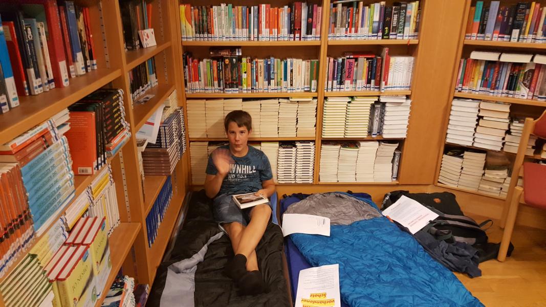 Danach ging es zurück in die Schule, wo eine aufregende Schatzsuche den sehr spaßigen und turbulenten Abend einleitete. Nach viel Spielen, Lesen und Herumgetobe fielen die ersten müden Krieger in ihre Schlafsäcke. Kräftig unterstützt wurden die Lehrerinnen von zwei Schülerinnen aus der 5.M - Emese und Misell. Auch ihnen ein herzliches Dankeschön!